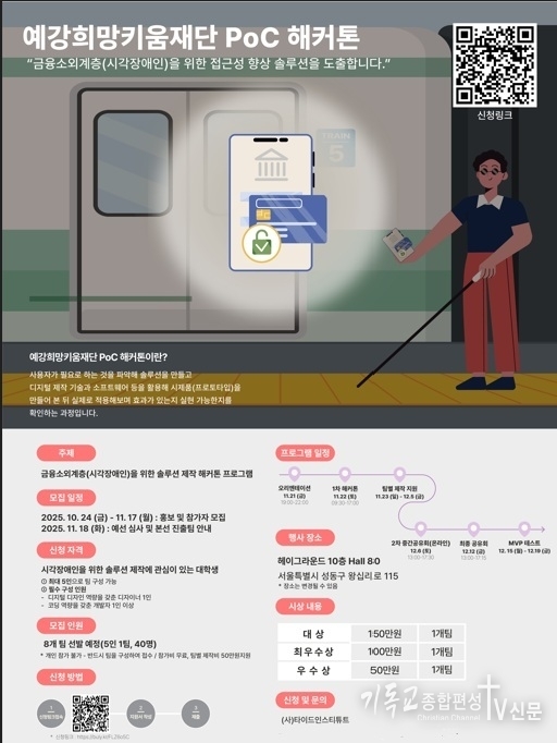 예강희망키움재단(대표이사 박상조)은 10월 24일부터 ‘PoC 해커톤(Proof of Concept 해커톤)’ 참가자 모집을 시작했다. 이번 해커톤은 (사)타이드인스티튜트와 협력해 금융소외계층, 특히 시각장애인의 정보 접근성을 높이기 위한 혁신적인 기술 아이디어를 발굴하는 것을 목표로 한다.
