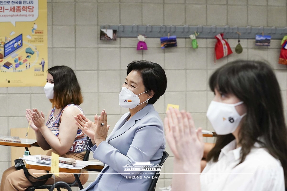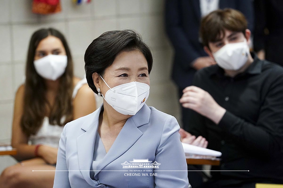 문재인 대통령과 스페인을 국빈 방문 중인 김정숙 여사가 17일 오전(현지시간) 바로셀로나 세종학당에서 수업을 참관하고 있다